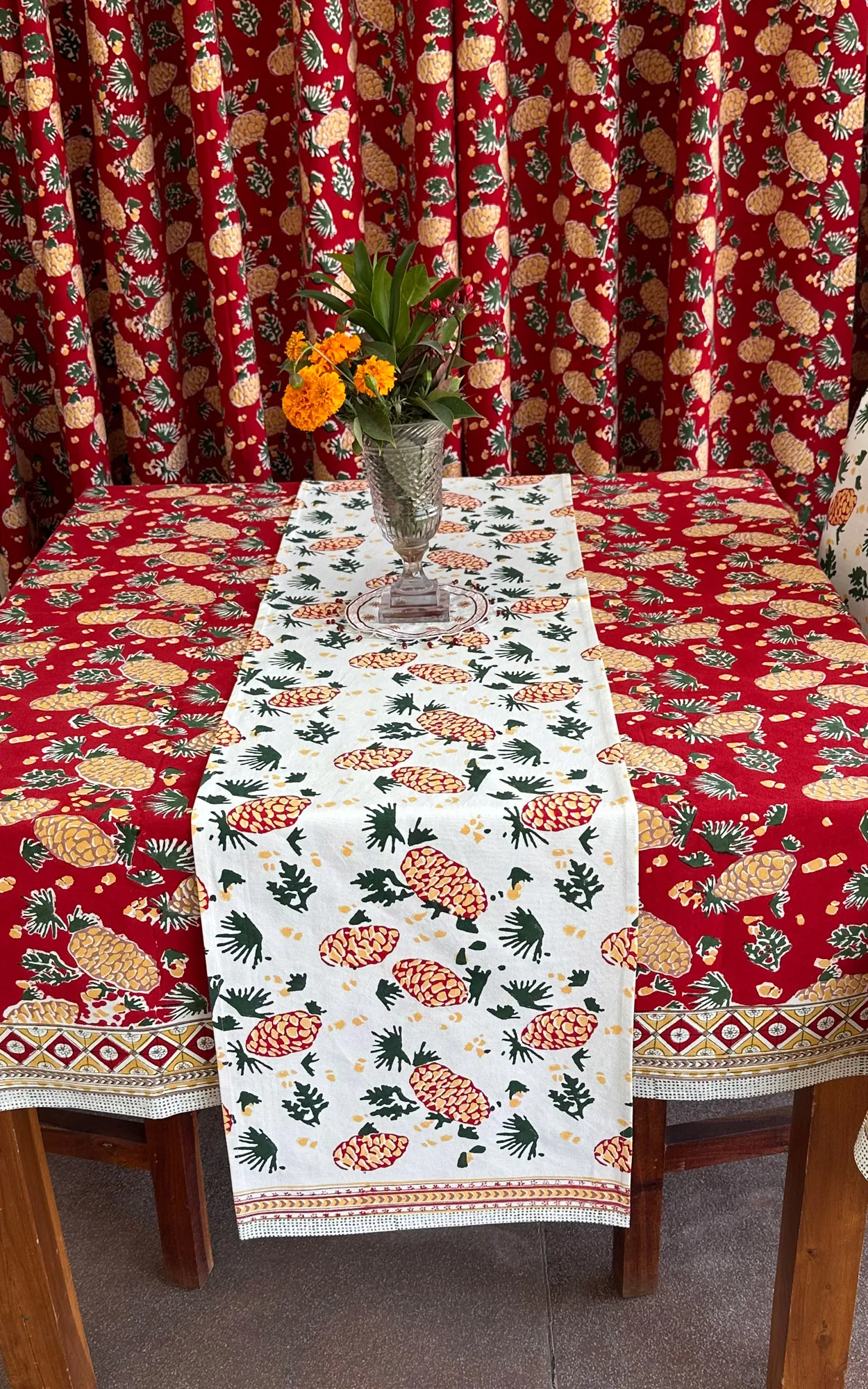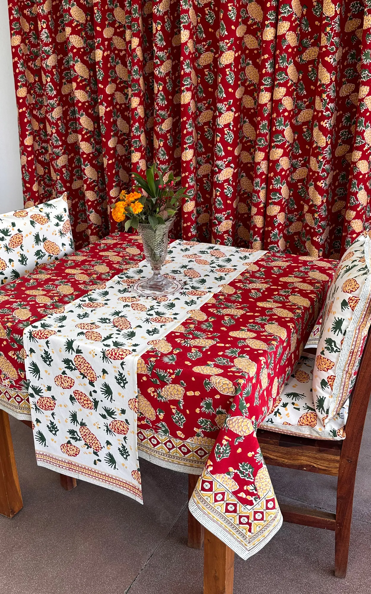 Care Instructions :    Cotton is a natural durable fabric that can generally be machine washed with no ill effects. Hand printed using wood blocks, machine wash warm, normal cycle, no chlorine bleach, do not soak, spin dry.