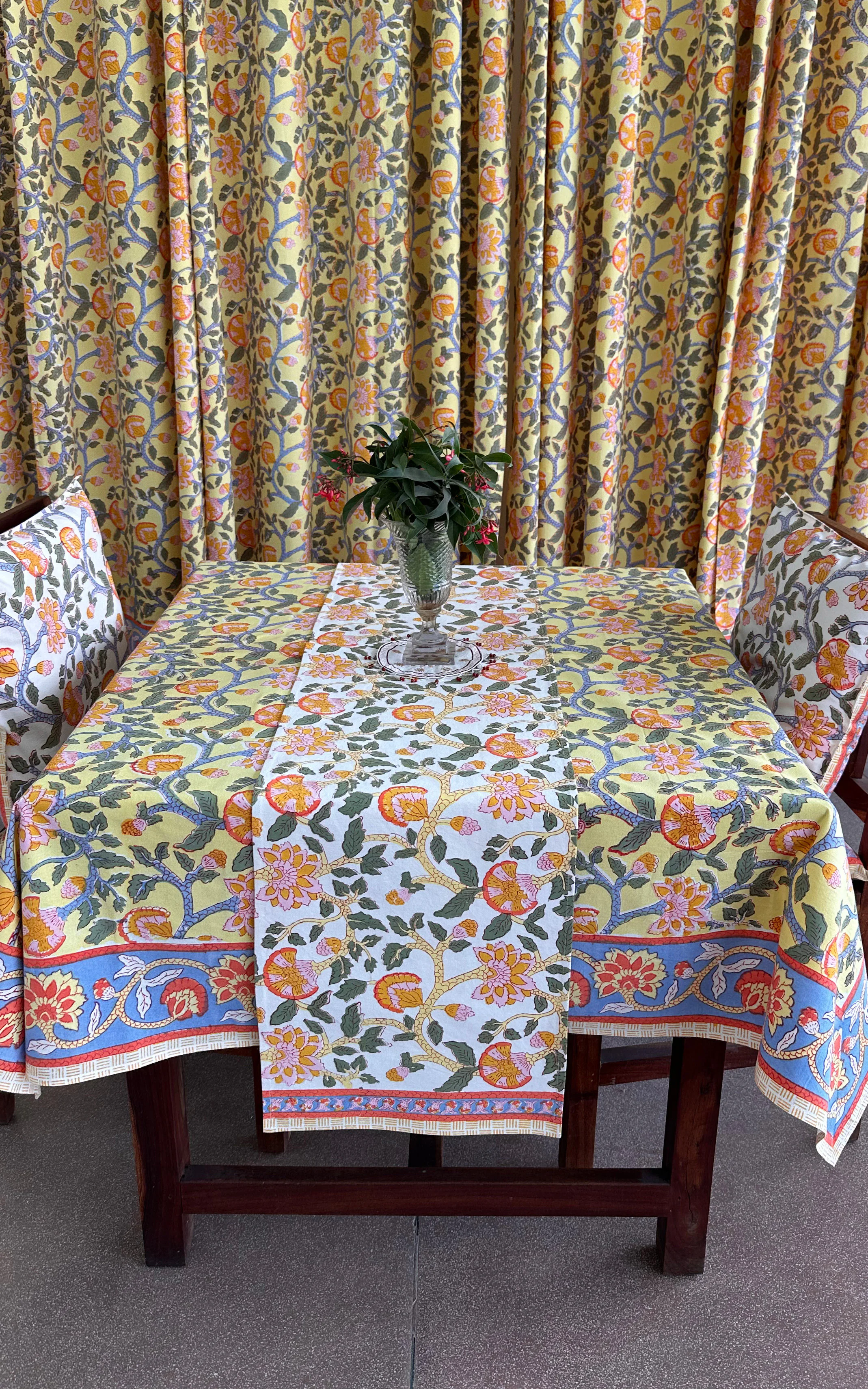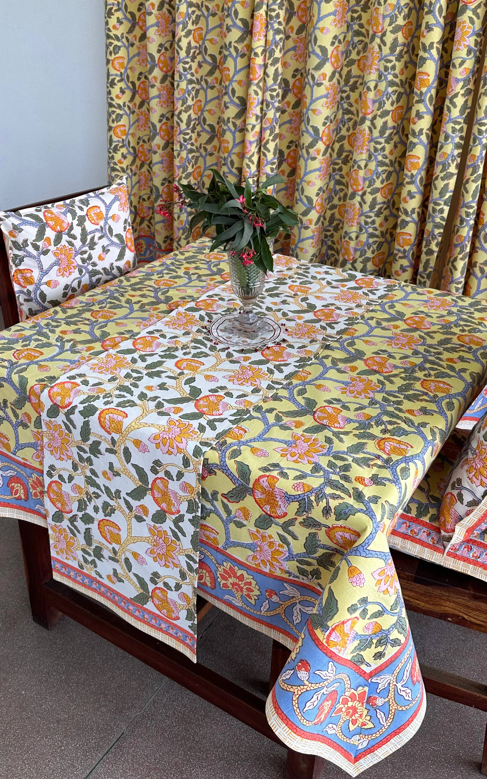 Care Instructions : Cotton is a natural durable fabric that can generally be machine washed with no ill effects. Hand printed using wood blocks, machine wash warm, normal cycle, no chlorine bleach, do not soak, spin dry.
