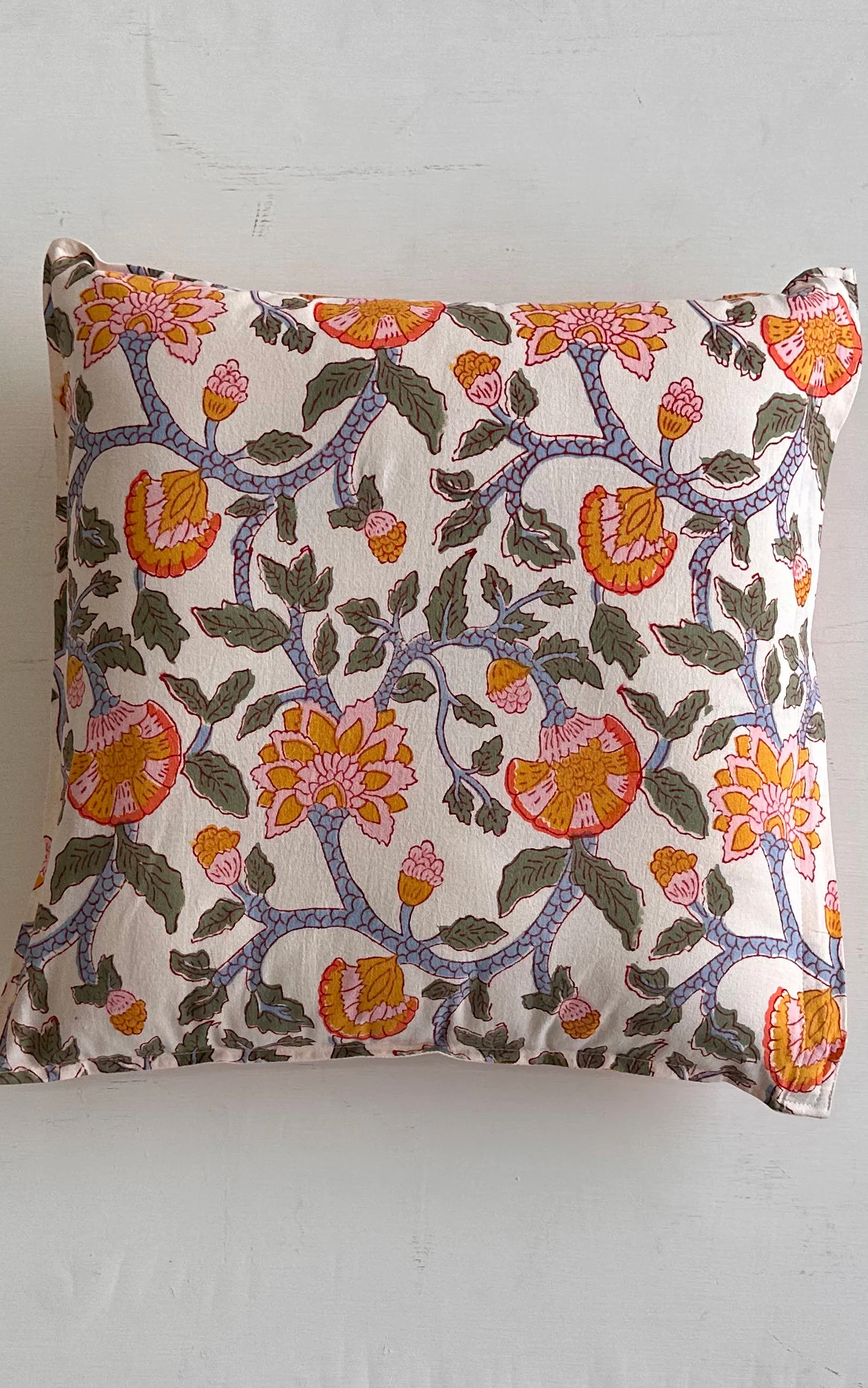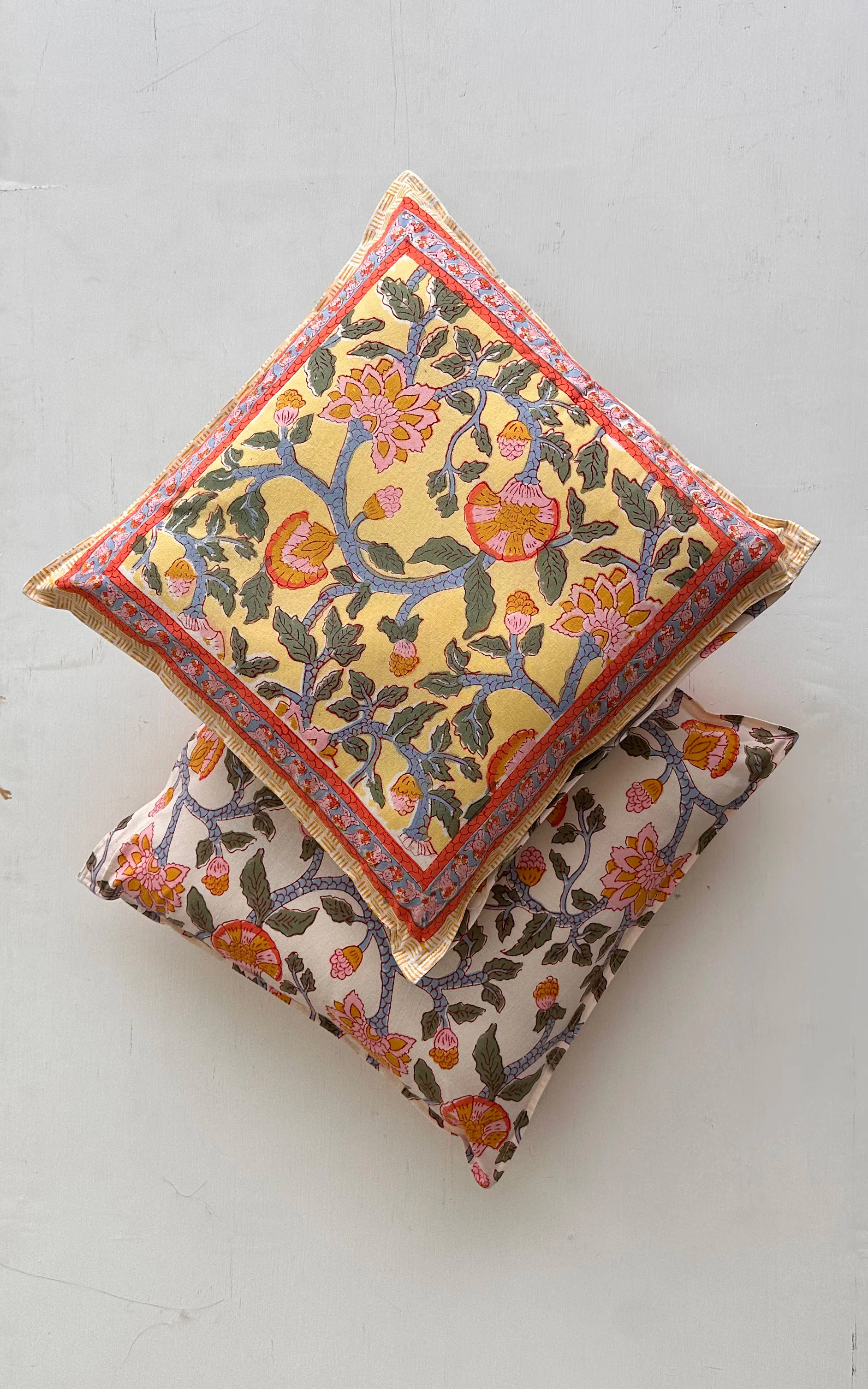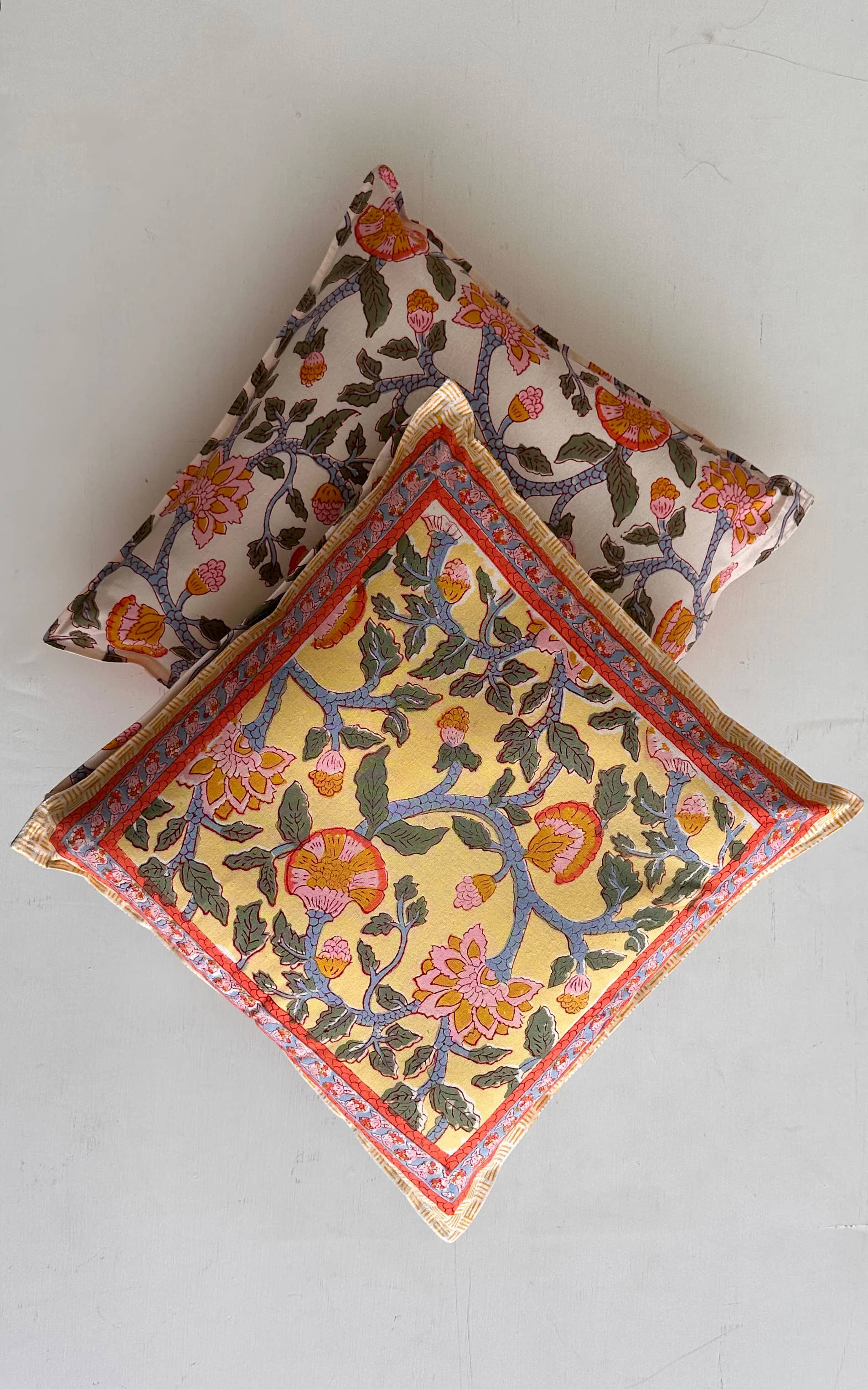Care Instructions : Cotton is a natural durable fabric that can generally be machine washed with no ill effects. Hand printed using wood blocks, machine wash warm, normal cycle, no chlorine bleach, do not soak, spin dry.