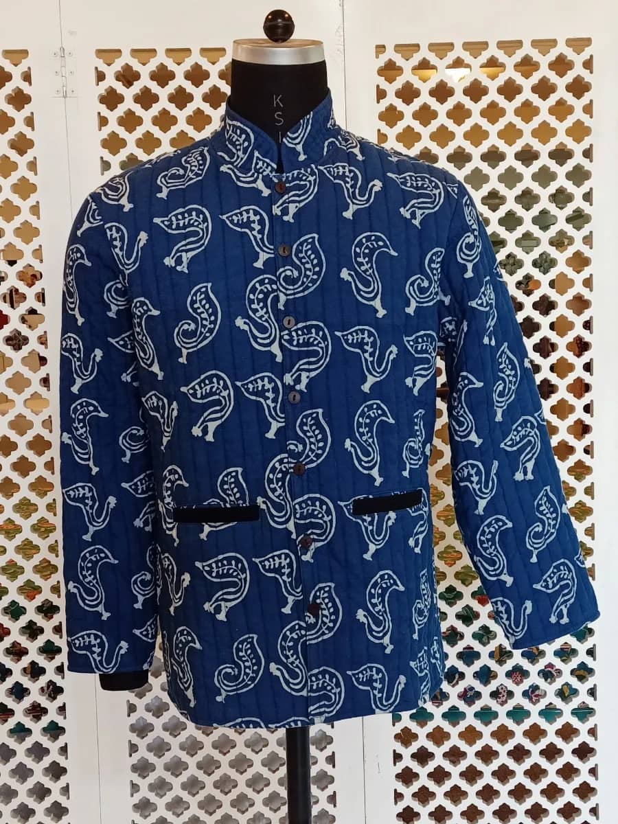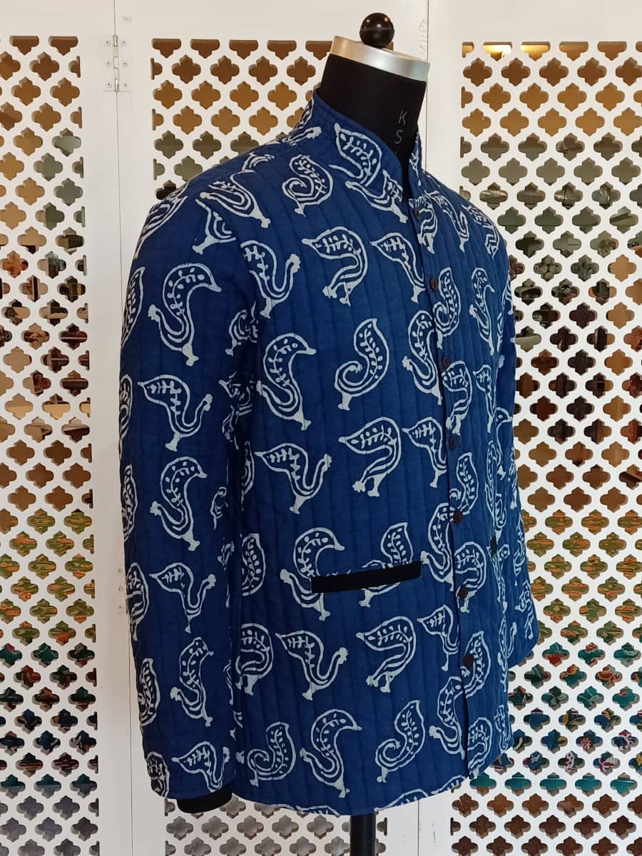The unprinted section of the fabric absorbs the Indigo and the resist-printed part retain the original colour.