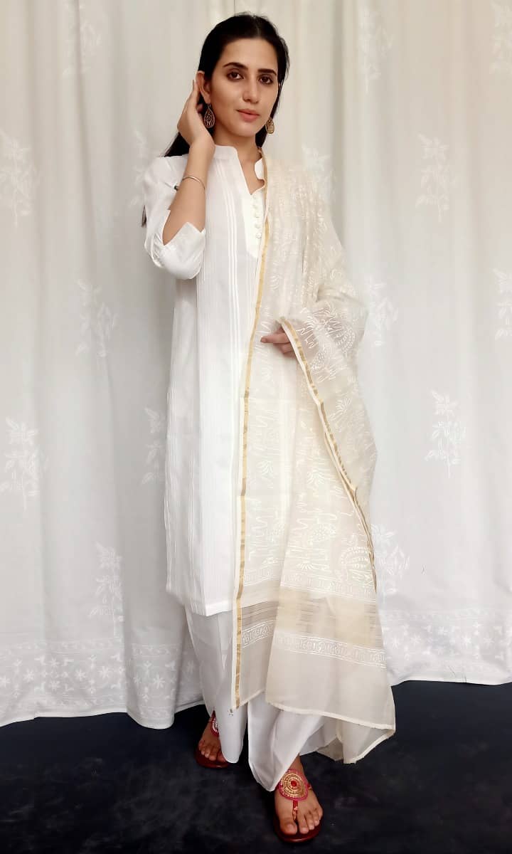 All natural fabric, hand loomed in Central India using silk wrap and cotton weft by expert weavers.