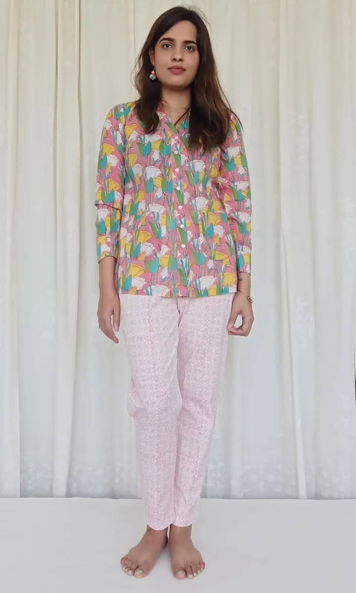 100 % Cotton with lycra hand block printed.